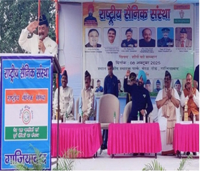October 8, 2025, Shaheed Smarak Park, Meerut Road, Ghaziabad - The Ghaziabad unit of the Rashtriya Sainik Sanstha organized a "Shourya Ko Samman" program here today. Chief Guest, Honorable Lieutenant General Gurmeet Singh, Governor of Uttarakhand, said that bravery should be respected at all times and everywhere. Professor (Dr.) Pawan Sinha Guru Ji, founder of the Pavan Chintan Dhara Ashram, suggested that a booklet detailing the bravery displayed by Indian soldiers from 1948 to Operation Sindoor should be given to every school. NDRF Commandant DIG Shri P.K. Tiwari suggested that every school in Ghaziabad should visit Shaheed Smarak Park at least once a year to pay tribute to the martyrs who have sustained our existence.